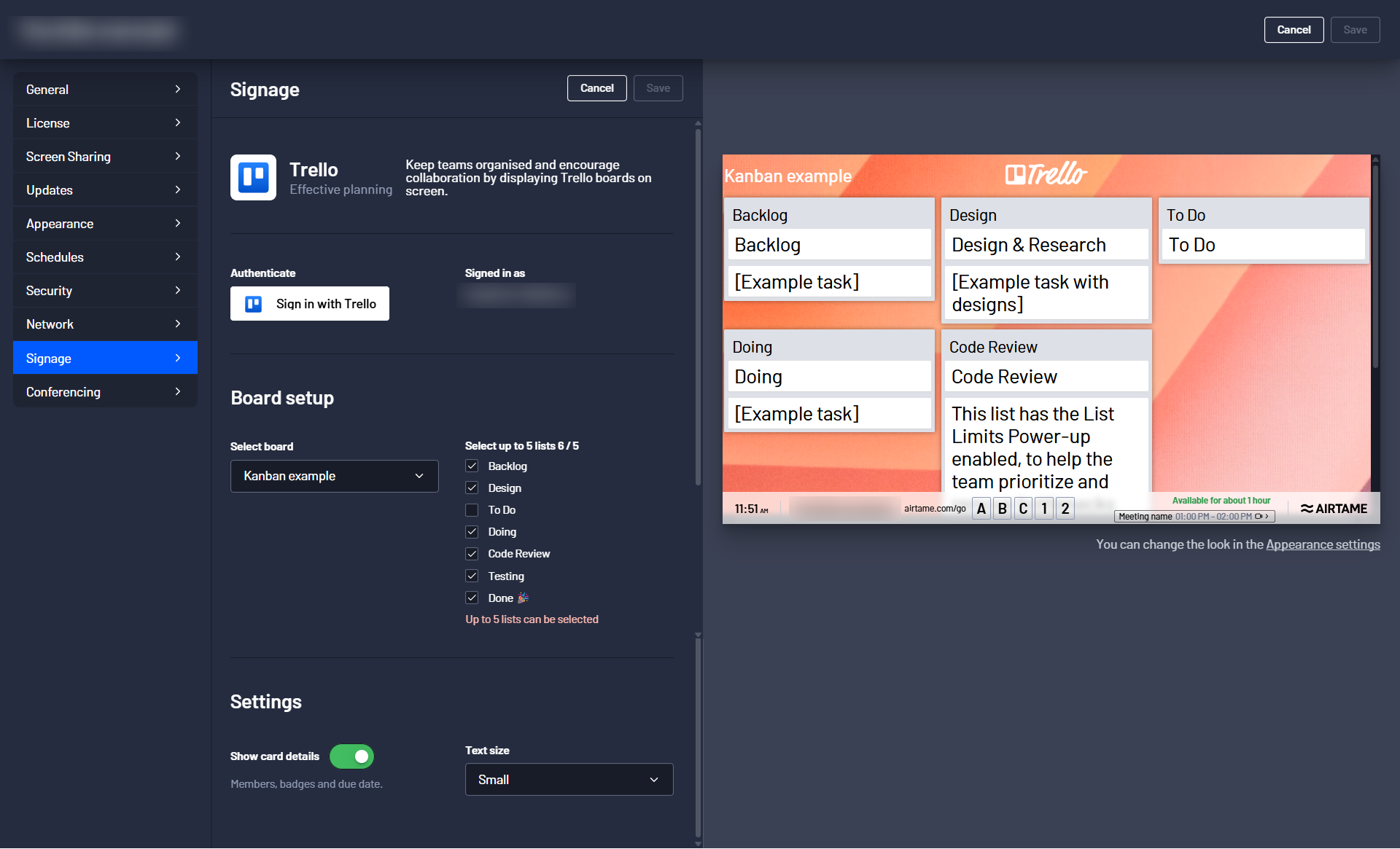 Changes made to the Trello board online will be automatically updated on the screen. The refresh interval depends on the Airtame device's settings.